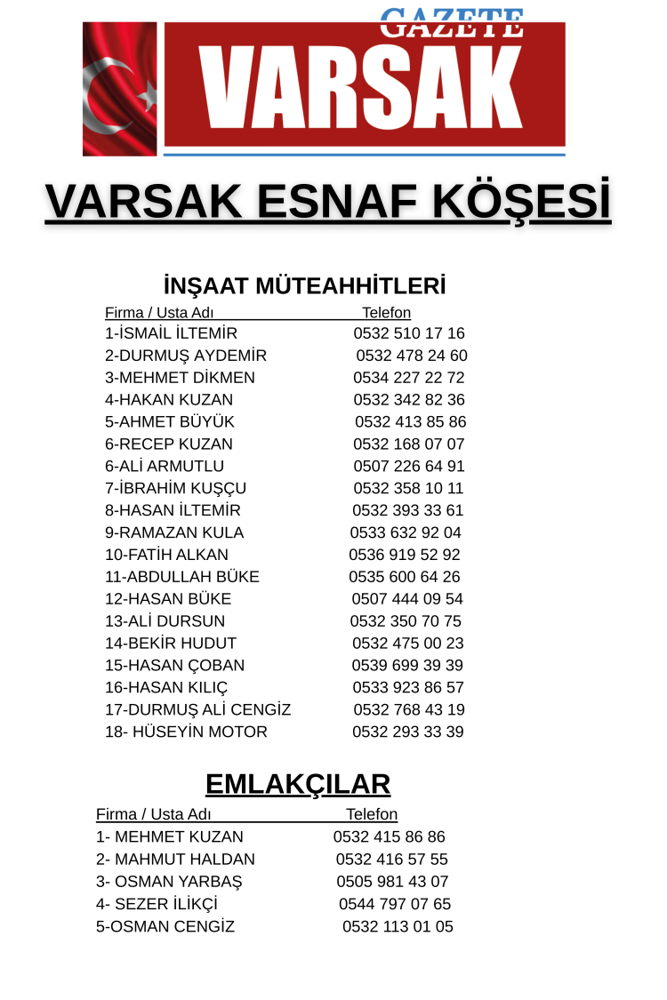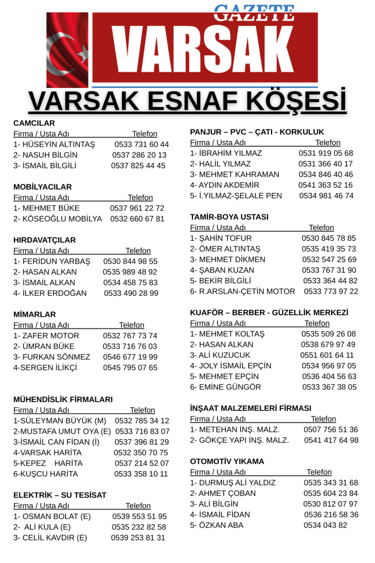 Bu özel köşe; camcılardan hırdavatçılara, kuaförlerden elektrik–su tesisat ustalarına, mühendislik firmalarından inşaat müteahhitlerine kadar Varsak’ın tüm esnaf profilini bir araya getiren kapsamlı bir rehber niteliği taşıyor.